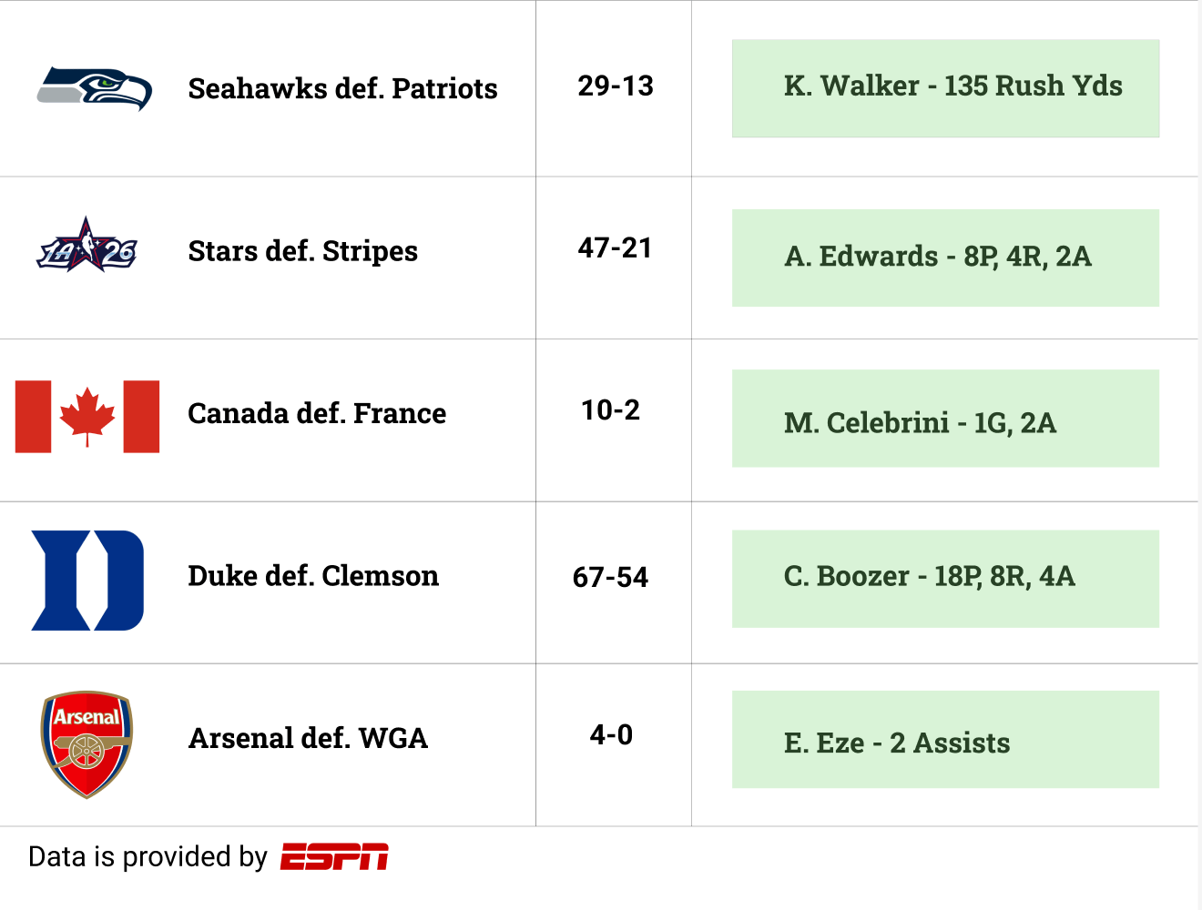 The game remained a defensive stalemate for three quarters, with Seattle leading 12-0 at the start of the fourth. The floodgates opened in the final period as Sam Darnold found AJ Barner for the game's first touchdown, followed later by a decisive 45-yard pick-six by Uchenna Nwosu that iced the game. The Patriots finally reached the end zone via two fourth-quarter touchdown passes from Maye to Mack Hollins and Rhamondre Stevenson, but it was too little, too late against Mike Macdonald’s relentless defensive scheme.