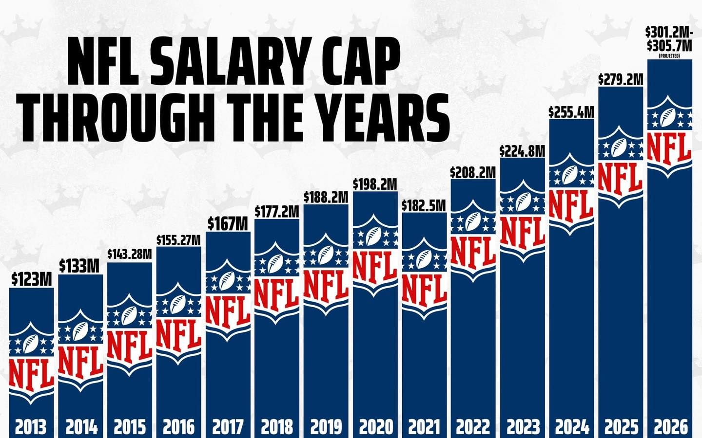 The NFL quietly crossed a psychological threshold last week when the league announced the 2026 salary cap will land at a record $301.2 million, a jump that fundamentally reshapes how teams will operate over the next several seasons. It’s the first time the cap has crossed the $300M mark - and it didn’t happen by accident. Exploding media rights deals, international growth, and league-wide revenue sharing have turned the cap from a limiter into a strategic weapon.